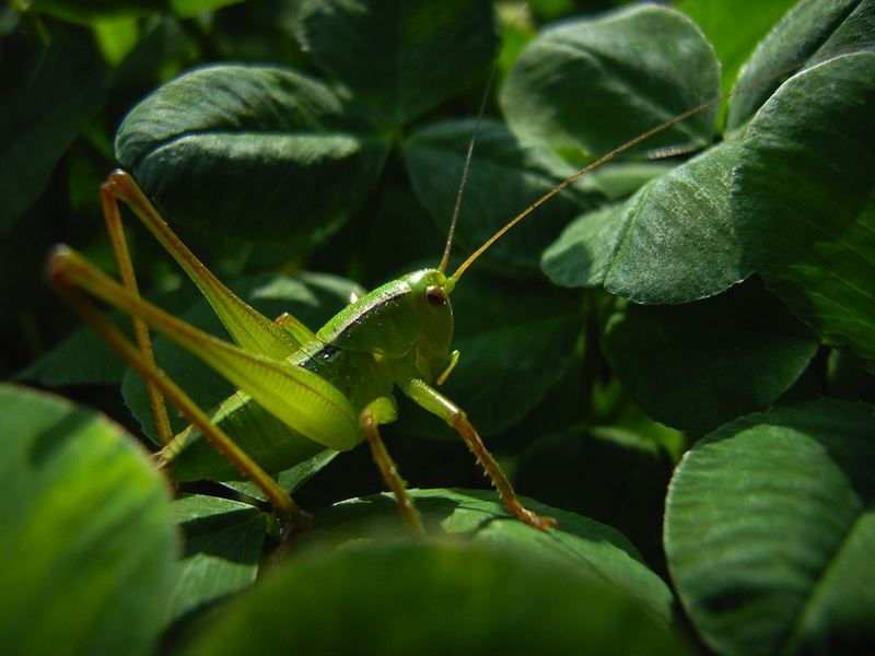 犬様との散歩途中の草むらにいた若いキリギリスです