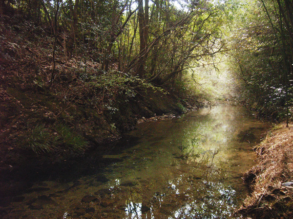 BBQ用コンロをならべた四阿の脇を抜けて、ペットのヤギの柵のそばから降りたところにはキレイな川が